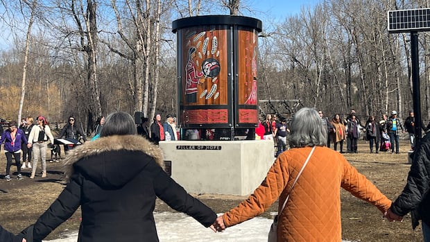 The family members of Indigenous women and girls who have gone missing or been murdered along the Highway of Tears in northern B.C. cried and held hands as a monument created in their honour was unveiled at Cottonwood Island Park in Prince George Friday morning.